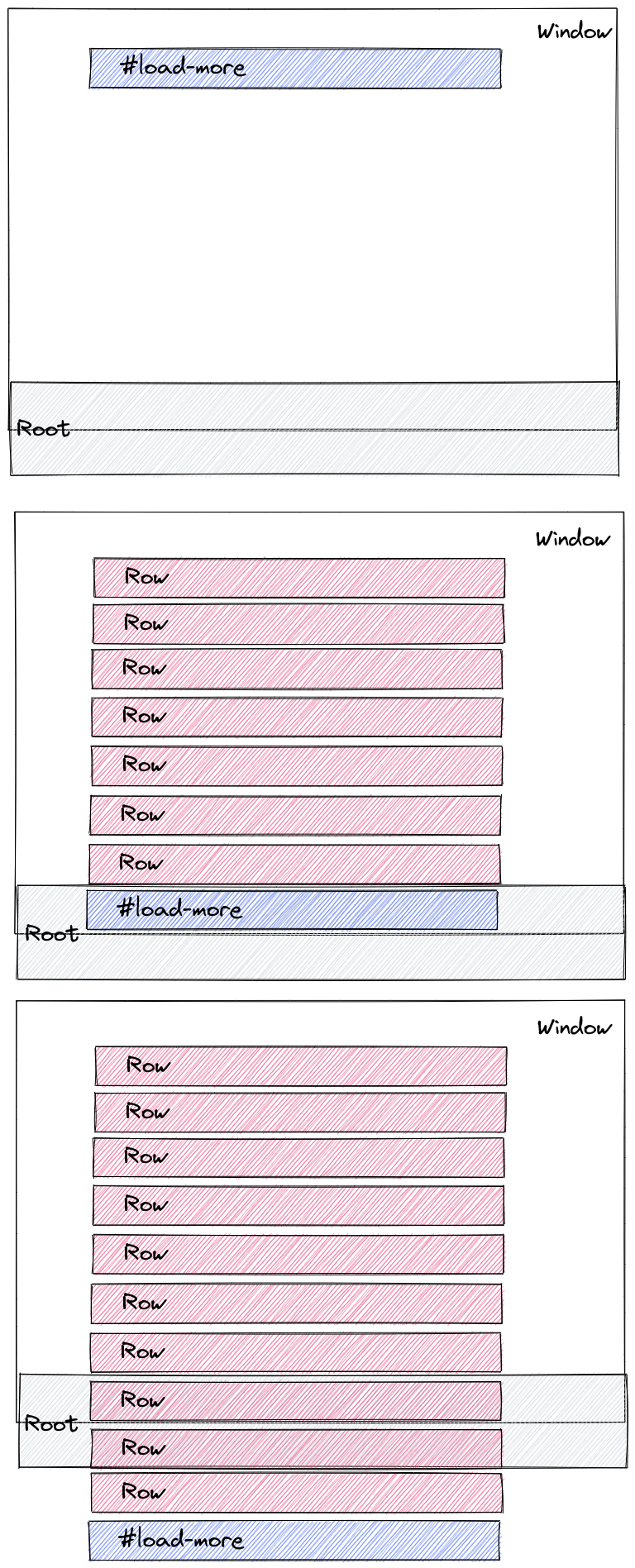 We used the IntersectionObserver to trigger the load of more data. I use a modified rootMargin to put the root on the bottom of the page. Below a schema representing the boxes model.