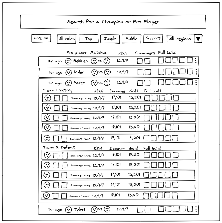 - Display games as row with the game time, the pro player, the matchup and some other stats.