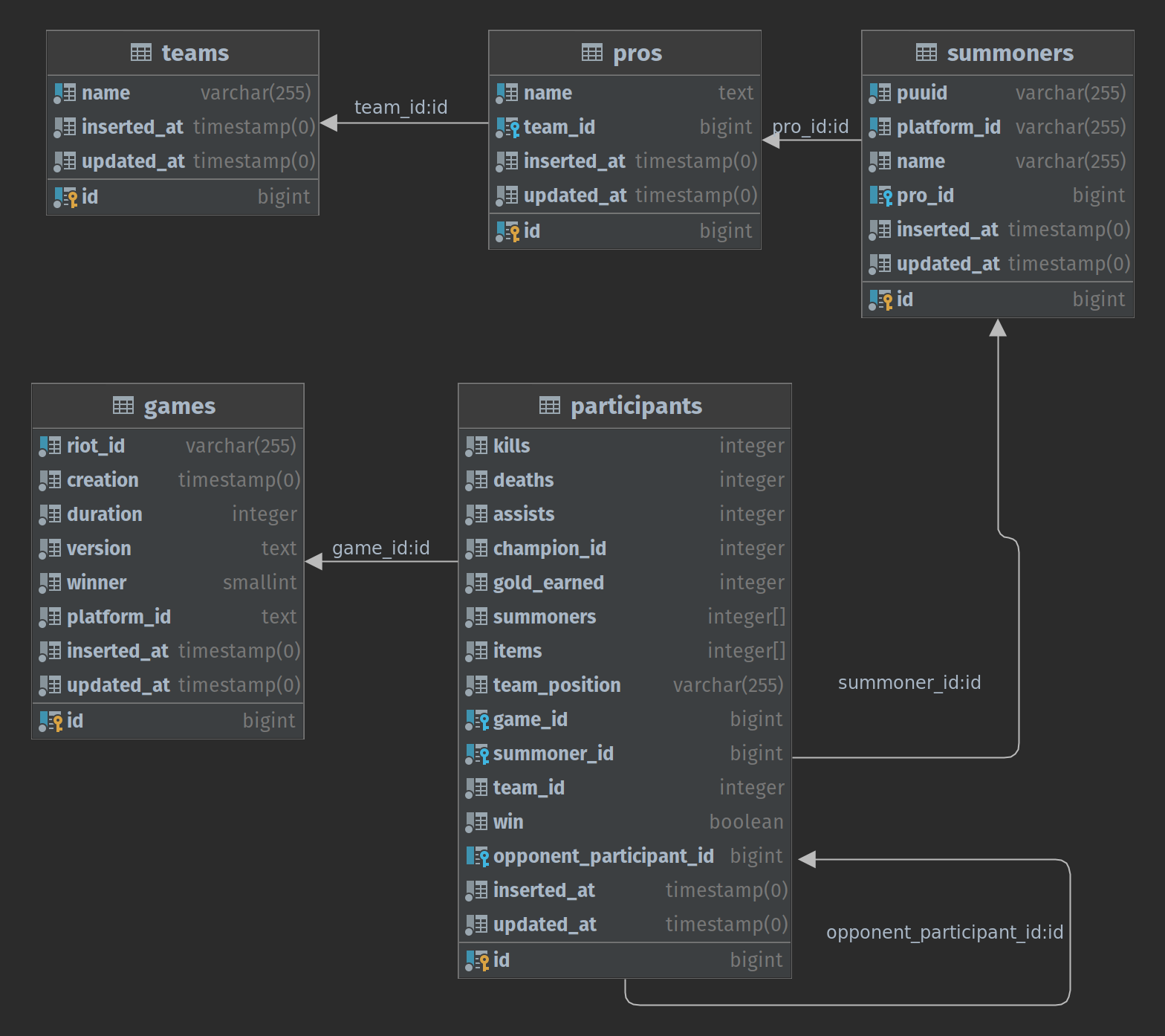 teamhave many pro players (ex: T1)prohave many summoners (multiples league of legends accounts ex: “Faker”)summonerhave many participants (ex: “Hide on bush”)gamehave 10 participants (league of legends is a 5vs5 players game)participanthave one opponentparticipant(participant have an opponent in the enemy team who have the same position ex: Middle, Top …)