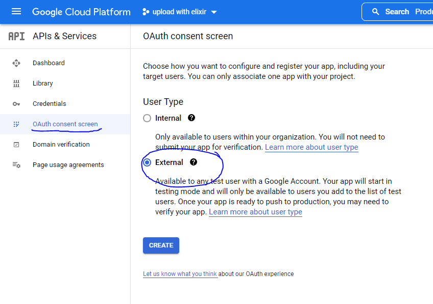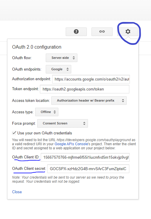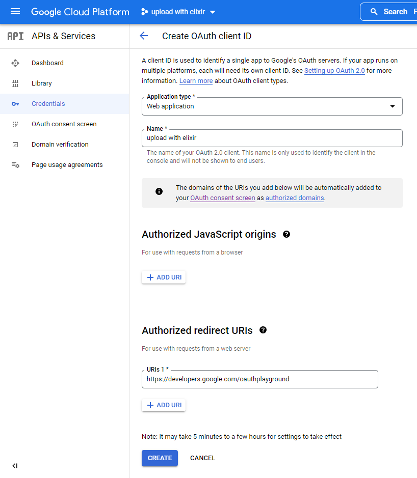 Choose Web application and fill the name and the return uri as https://developers.google.com/oauthplayground. This is mandatory to get the refresh token from the oauthplayground! Keep the page open you will need the client_id and client_secret.