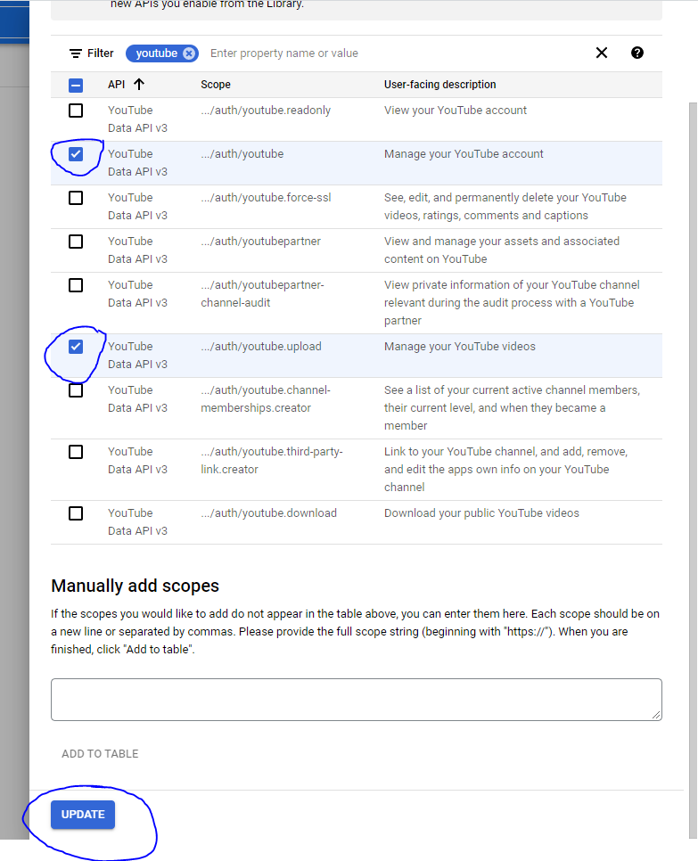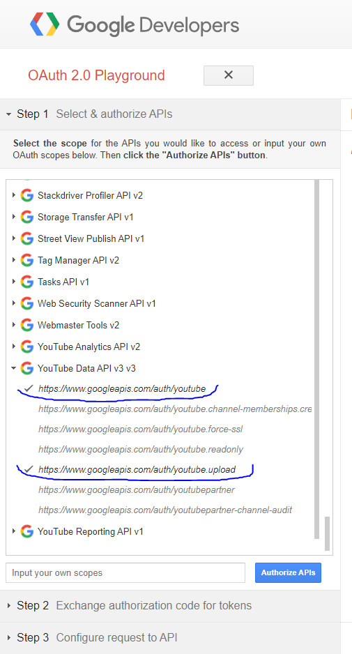 On left side tick youtube and youtube.upload then click on authorize api you will be redirected and prompted to give the youtube authorization to your app.